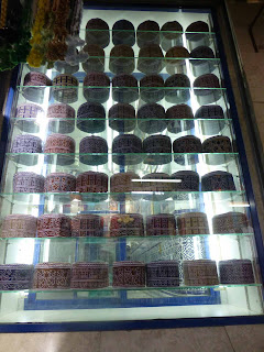 | This may be hard to see, but it is a display of the embroidered caps the men wear |